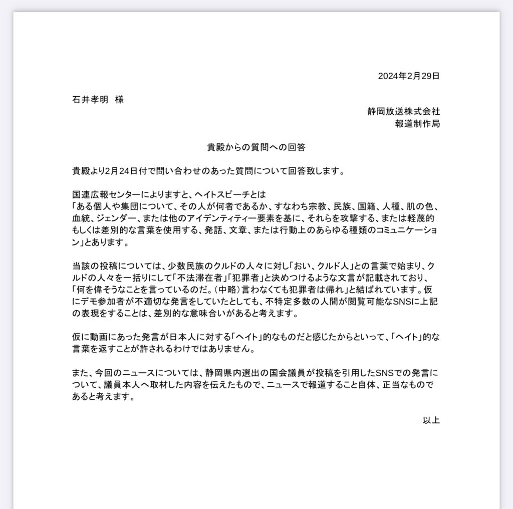 静岡放送は良識があるな。速報 静岡放送(SBS)日本死ねと言ったクルド人に帰れと言った私の投稿をヘイトと批判