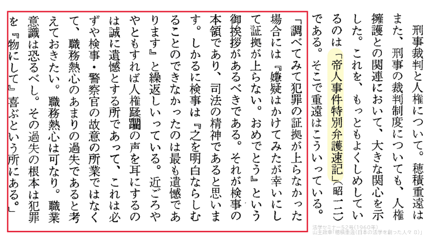 「調べてみて犯罪の証拠が上らなかった場合には『嫌疑はかけてみたが幸いにして証拠が上らない。おめでとう』という御挨拶があるベきである。それが検事の本領であり、司法の精神であると思います。しかるに検事は『之を明白ならしむることのできなかったのは最も遺憾であります』と繰返しいっている。近ごろややともすれば人権蹂躪の声を耳にするのは誠に遺憾とする所であって、これは必ずや検事·警察官の故意の所業ではなくて、職務熱心のあまりの過失であると考えておきたい。職務熱心は可なり。職業意識は恐るベし。その過失の根本は犯罪を『物にして』喜ぶという所にある。」これは検察官全員に読んでもらうべき名文だな。