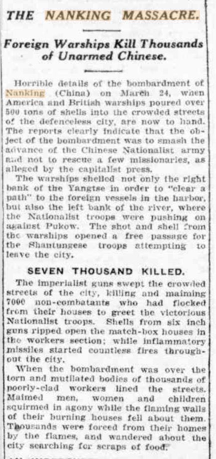 THE NANKING MASSACREForeign Warships Kill Thousands of Unarmed Chinese.Horrible details of the bombardment of Nanking (China) on March 24, when America and British warships poured over 500 tons of shelis into the crowded streets of the defenceless city, are now to hand. The reports clearly indicate that the ob- ject of the bombardment was to smash the advance of the Chinese Nationalist army nad not to rescue a few missionaries, as alleged by the capitalist press.The warships shelled not only the right bank of the Yangtse in order to "clear a path" to the foreign vessels in the harbor, but also the left bank of the river, where the Nationalist troops were pushing on against Pukow. The shot and shell from the warships opened a free passage for the Shantungese troops attempting to leave the city.SEVEN THOUSAND KILLEDThe imperialist guns swept the crowded streets of the city, killing and maiming 7000 non-combatants who had flocked from their houses to greet the victorious Nationalist troops. Shells from six inch guns ripped open the match-box houses in the workers section; while inflammatory missiles started countless fires through- out the city.When the bombardment was over the torn and mutilated bodies of thousands of poorly-clad workers lined the streets. Maimed men, women and children squirmed in agony while the flaming walls of their burning houses fell about them. Thousands were forced from their homes by the flames, and wandered about the city searching for scraps of food.