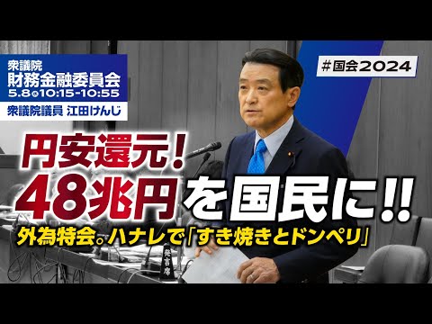 イエレン財務長官もこの一連の中で、要は変動相場制を取る国では為替レートは市場で決まるのが基本であり、為替介入は稀で、例外的な場合に限られると。これは自分のコミットメントだとおっしゃっています。当然、財務大臣も同意されますね。それはG7の今までの合意でございます。為替政策に関しては、為替レートは市場において決定されること、また、川市場における行動に関して緊密に協議をすることに加え、為替レートの過度な変動や無秩序な動きは経済および金融の安定に対して悪影響を与えうるということが、過去においてもG7で合意され、先月のG7の会合でもそれを改めて確認しました。常識的に考えると、為替介入の必要がある場合があることは私も認めますが、それは例外的で稀な場合です。外貨特別会計のバランスシートが膨らんだ場合、平時には市場と対話しながら徐々にそれを反対売買で売っていくことで、バランスシートを圧縮できる。それが普通です。ドイツやイギリスも、先進国はみんな日本の1/4や1/5、カナダに至っては1/10の額しか持っていません。変動相場制とはそういうものです。固定相場制類似の国、例えば中国は2005年まではドルペッグ(固定相場制)で、現在はドルペッグの管理変動相場制と呼ばれています。中国は多額の外貨準備を持っていますが、それも極めて例外的な介入のためです。200兆円も持っていること自体が、いくら説明しても正当化できません。・・・・あの、それもはっきり申し上げておきますが、今の財務省がいかに変なことをやっているか。じゃあ、その背景に何があるのかということですが、これは財務省OBのある方が指摘しているんですけど、やっぱり天下りがあるんじゃないかと。この200兆円の保管先がありますよね。これ、保管されている相手は誰ですか。この200兆円、民間の金融機関だと思いますが、外貨建資産の運用委託先あるいは保管先については、非常に不測の影響を与える恐れがあるため、お答えは差し控えます。そして、この保管料で10億円近い保管手数料を国から払っているんですよ。それで、これ保管ですからね、明らかに信託銀行なんです。こういう名詞は出しませんが、信託銀行に信託しているわけです。この額を考えれば、信託銀行以外にあり得ないですよ。常識で考えても。こういう名詞はあえて出しませんけれども、そこにこの5年間で7人も天下っているじゃないですか。財務省の資料でもらいましたが、7人も天下っているんですよ。・・・・・---あの、2011年に予算委員会で「この米国債を売れ」とは言いません、ただ、米国債も満期になって返ってくる償還金があるじゃないですか、その償還金を使えという提案を、もうすでに2011年にやっております。そして、今回も同じように、今度は円安ですから、わざわざ米国債の満期になって返ってきたお金を、財務省は全額また米国債を買っているんですよ。なんでこんなことをやっているんですか?理由を説明してください。具体的に満期を迎えたものについて、どういう形で運用しているのか、その詳細はお答えを差し控えますけれども、従来から申し上げております通り、将来の為替介入等に備えるための外貨資産であるという観点から、安全性・流動性に配慮しながら運用しているということでございます。当時は国民も気づきませんよ。147円のレートで200兆円規模にあるわけですから、機械的な計算で分かります。含み益はいくらですか?これはもう事務方から解答が来ていますから、局長、答えてください。あの、外国為替評価損益ですが、まず直近で公表しております数字、これは昨年公表いたしました数字でございますけれども、昨年3月末時点での含み益・為替評価損益が19.5兆円ということでございます。足元の数字というお尋ねかと存じますけれども、これなかなかその時々でポートフォリオの中身が変わるのは難しいわけですが、仮に昨年3月末の外貨資産の外貨建ての金額に、そのまま足元3月末のレートを当てはめますと、ざっくり試算をいたしまして、機械的に計算すれば48兆円ほどの含み益ということになります。200兆円で48兆円の含みがあるということですね。それで、私が指摘した償還金、これは確か令和4年度は21.5兆円でしたが、足元の為替レートで計算すると、今その償還金はどのくらいにのぼっているのですか?これも昨年11月に公表してございますけれども、令和4年度末時点での外為特会の外貨資産の内訳というものを公表してございます。その時点で、満期別構成割合で見ると、満期1年以下の保有債権は21.5兆円でございます。足元の数字につきましては申し訳ございませんが、昨年の令和4年度末時点の数字が直近の公表された数字でございます。今の150円のレートで引き直すと、大体30兆円前後なんですよ、今の償還金は。申し訳ないけれども、常識で考えてください。私はね、満期になる前の米国債を売れと言っているわけじゃない。ただ、場合に