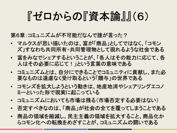 協同組合においては、構成員の労働者たちは、自分たちで出資し、共同経営者となりま す。そうすることで、労働者は自分たちで能動的に、民主的な仕方で、生産に関する意思 決定を目指します。資本家たちに雇われて給料をもらうという賃労働のあり方が終わりを おげ、自分たちで主体的、かつ民主的に会社を経営するようになるわけです。(p209)