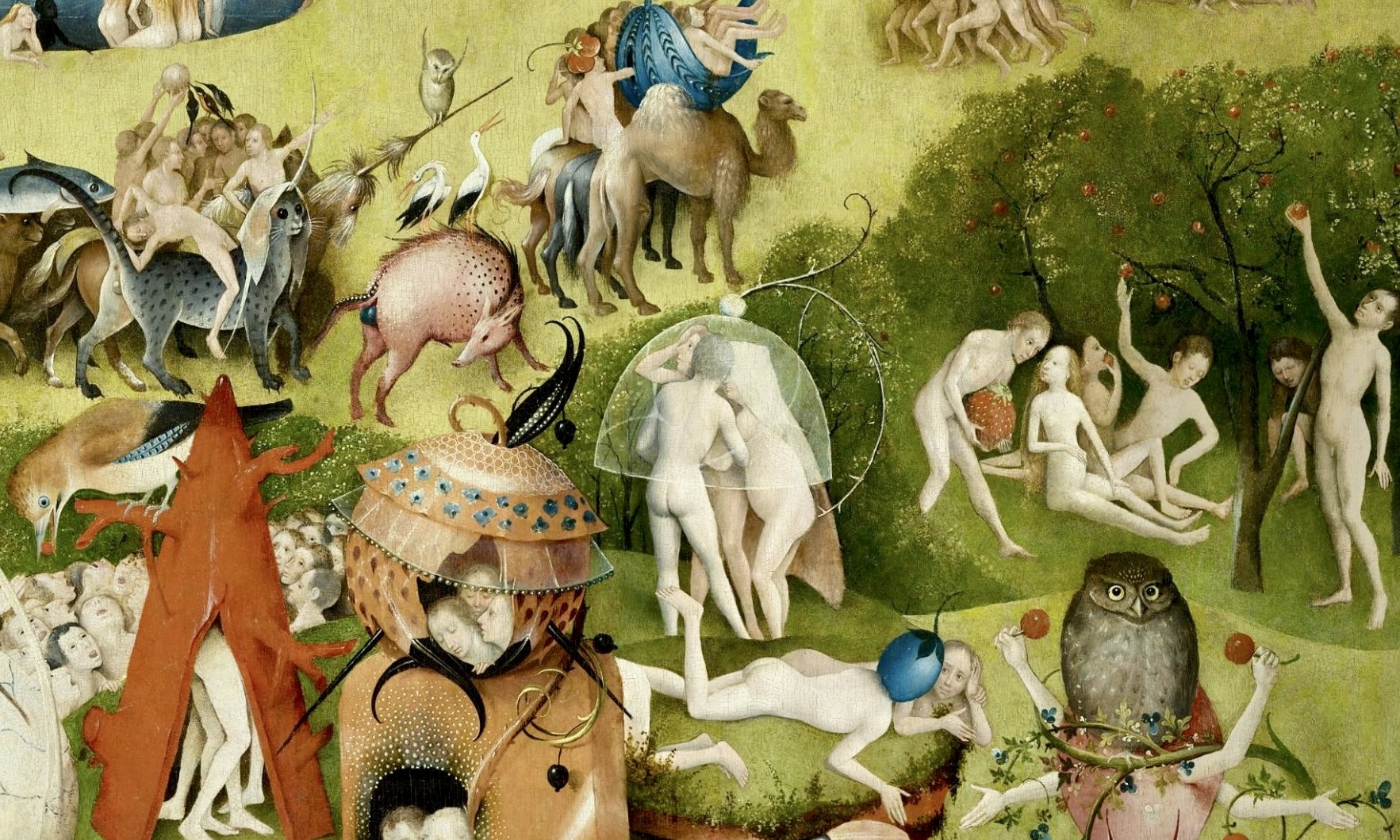In the next, God is noticeably absent. The garden is populated by people (and odd creatures) indulging in gluttony and lust. Rather than obscenity, Bosch depicts this through innuendos known in his day, like picking fruit as a euphemism for sex. One popular interpretation is that Bosch is showing how humanity would behave if there hadn't been the Fall — living in paradise with no knowledge of good and evil...神が存在せず、善悪も忘れれば、人は性行為にふけって天国に!、ということかな。